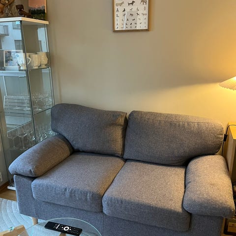 Deilig å sitte i.. Tar liten plass men føles alikevel romslig. Den har en liten skade inne på platen bak ryggen. Inne i selve sofaen. Men det har ingenting å si på sittekomfort og er heller ikke synlig. Jeg har montert hjul på den så den skal være enkel å flytte rund i rommet. Men orginal ben følger med, eventuelt så setter jeg de på igjen om du ønsker det.