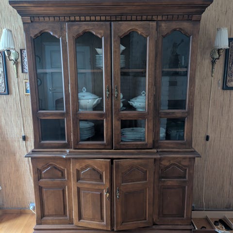 Vitrineskap i mørkt tre og kommoden