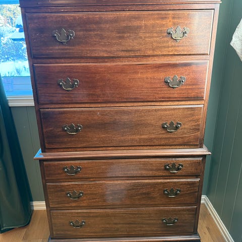 Pen og solid kommode i fransk / Louis-stil selges. Laget i mørkt tre mahogni med dekorative messingbeslag. Et elegant møbel som passer perfekt i stue, spisestue eller soverom.