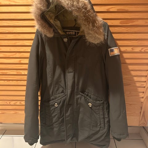 Praktisk og pen vinterjakke/parkas med fuskepels i hetten. Varm og god, fra merket Jofama. Pent brukt, ingen synlig slitasje så mye bruk igjen.