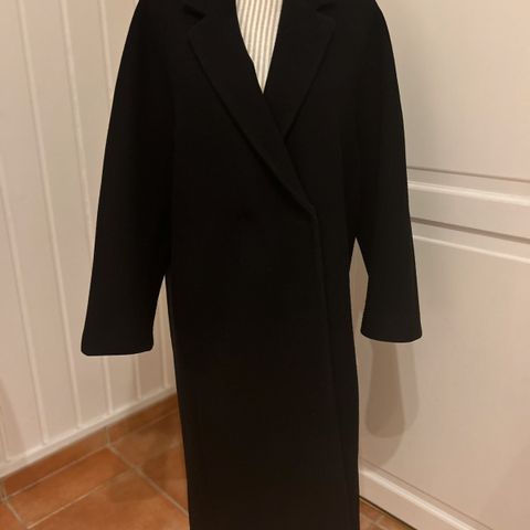 Ny lang, dobbeltspent kåpe med rette sidelommer.Lang splitt i ryggen. Rett modell.Str xs men passer s også.