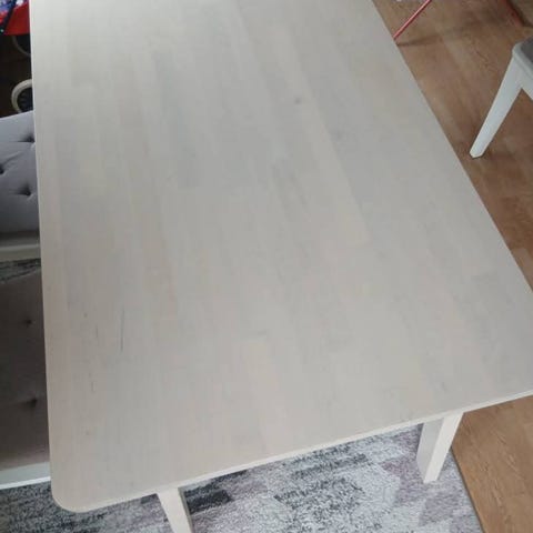 Bordene er solide i heltre og kan slipes og oljes/beises etter ønske. Bordoverflatene trenger en skikkelig skrubb eller sliping så blir det som nytt.