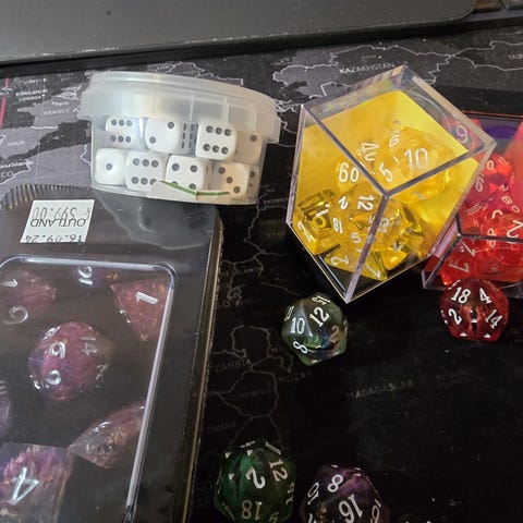 To terninger med Lollo og Bernie i farger. Hver terning måler omtrent 2,5 cm i størrelse. Kan brukes til spill eller som lekeobjekt for barn.