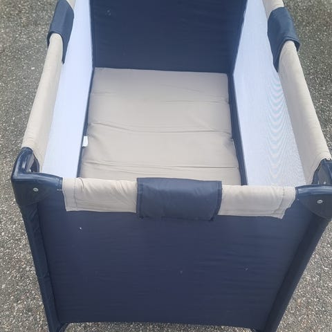 Reiseseng som passer til barn opp til 2 år. Madrass føller med hvis ønskelig (kan vaskes). Det var hull på sider av nett men det er fikset nå.