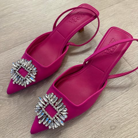 Lekre slingbacks med kitty heels og dekorativ spenne. Blå/lilla farge.