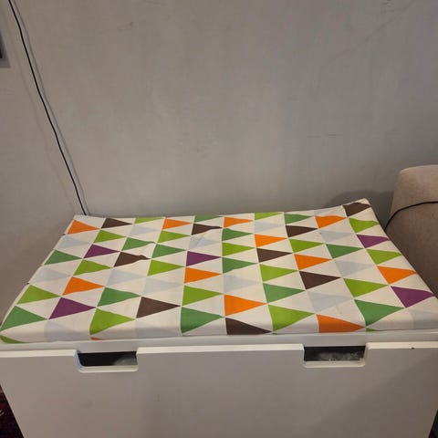 IKEA oppbevaring med mønstret pute i flere farger. Oppbevaringsløsning for barnerommet med hvit kropp og fargerikt trekantmønster på lokket. Lokket har noen synlige flekker og bruksspor. Møbelet er laget for oppbevaring av leker og annet barnerelatert utstyr