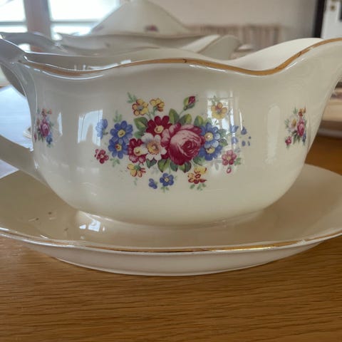 Sausenebb fra Alfred Meakin, England. Fra ca 1926. Intakt dekor, ingen skår eller hakk. Aldri vasket i maskin. En "sprekk" /stripe ved helletuten og under, men den er ikke lekk. Blank og pen.