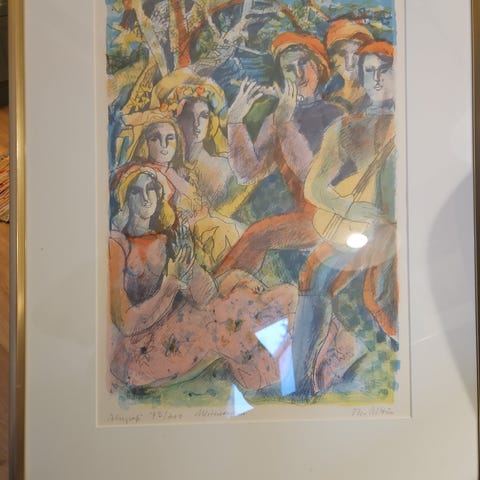 Eldar Parr 2 stykk kunsttrykk med blått motiv, innrammet i en mørk ramme. Bildet viser detaljerte mønstre og figurer i blåtoner. Passer til veggdekorasjon i hjem eller kontor. Rammedimensjoner er omtrent 59 cm x 44 cm.
