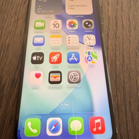 Telefonen har knust skjerm men fungerer aom dek skal, tlf har synlige riper og sprekker i skjermen, og batteriets maksimale kapasitet er 73%.