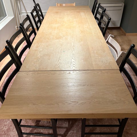 Ettersom ileggsplaten ligger i bordet er det ganske tungt. Kjøper må ha med bærehjelp. Ben kan enkelt skrus av.
