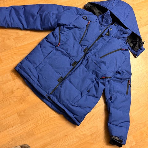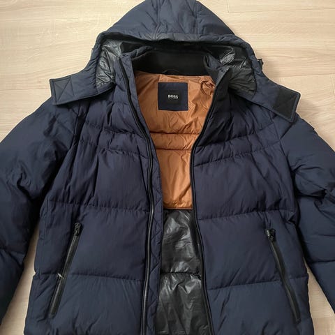 Hugo Boss vinterjakke/dunjakke i blå farge, størrelse L. Jakken er designet for menn og egnet for kalde værforhold. Dunjakke 80% andedun og 20% fjær. Kjøpt i 2020 på Triaden Lørenskog. Ikke brukt siste to vinter pga. størrelse. Jakken har flere lommer med knapper og glidelås, samt en frontåpning med glidelås og knapper. Uten flekker/skader og i god stand.