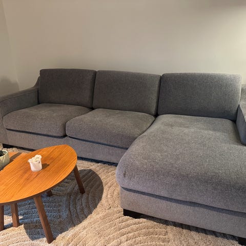 Pent brukt sofa. Stått på et soverom.