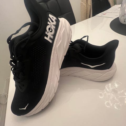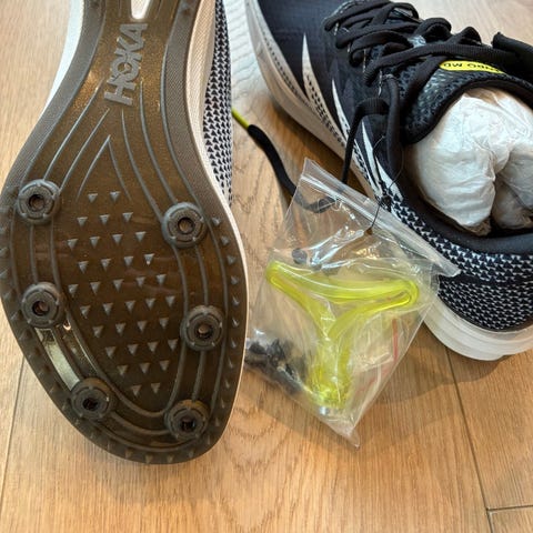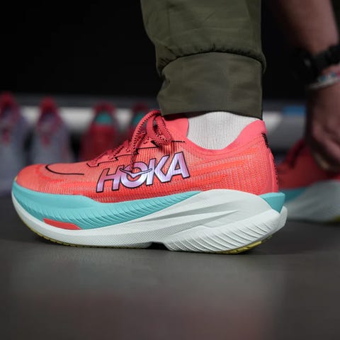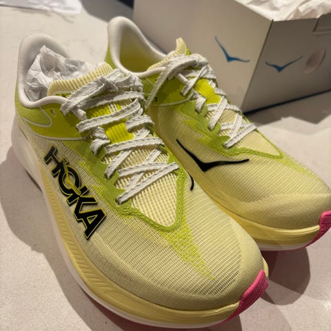 Hoka U Huaka Origins løpesko i størrelse 44. Skoene er designet for løping og har en flerfarget overflate med blå, rosa og gule detaljer. Yttersålen har mønster for grep og støtte under løping.