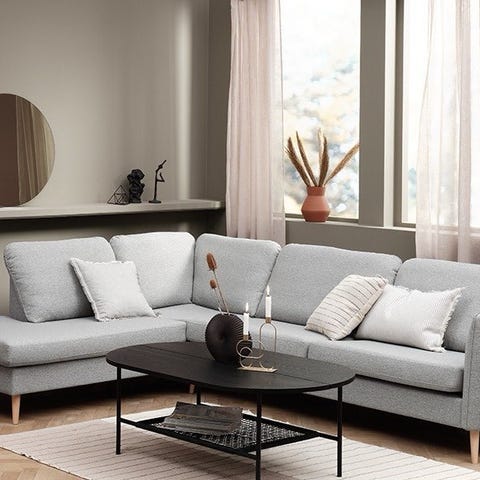 Hjørnesofa. Mål: 265 x 200 cm. Et lite hull i skamelstoffet. Må hentes i Elverum. Bord som vist på bildet kan følge med.