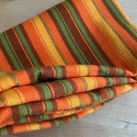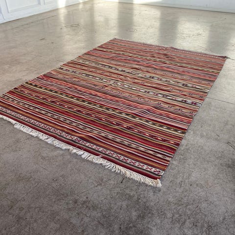 Nydelig vevd ullteppe i kraftige klare farger. Frynser av bomull.