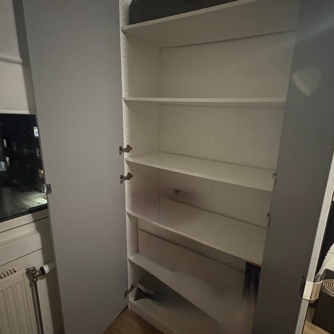 Skapet er i god stand, foruten om at nederste planke til høyre mangler på den ene delen av skapet, samt at skuffen over er litt løs/skjev (bør være enkelt å fikse). Ellers er det ingen riper eller liknende.