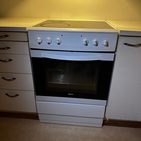9 år gammel Gram keramisk komfyr med keramisk kokeplate og ovnsfunksjon. Bruksmerker både på kokeplatene og inn i ovnen. Men fungerer utmerket.