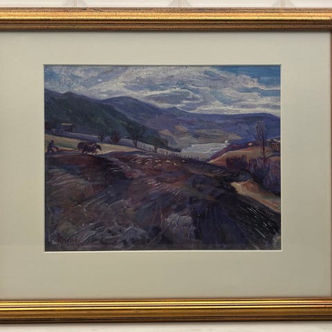 Innrammet fotografi som viser et landskap med trær og en liten bygning nær vann. Bildet er i farger og har en mørk ramme rundt. Egnet som dekorasjon for interiør.