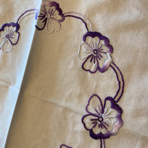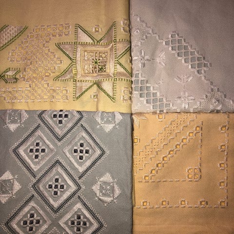 Selger et flott gammelt heklet sengeteppe i hvitt .