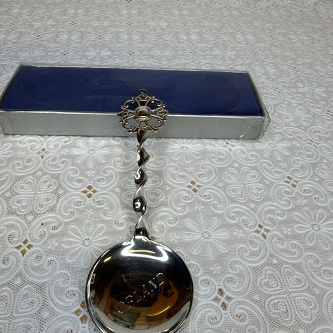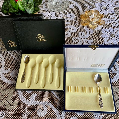 6 gamle teskjeer i flott etui - PRINS - merket N.M. 8.