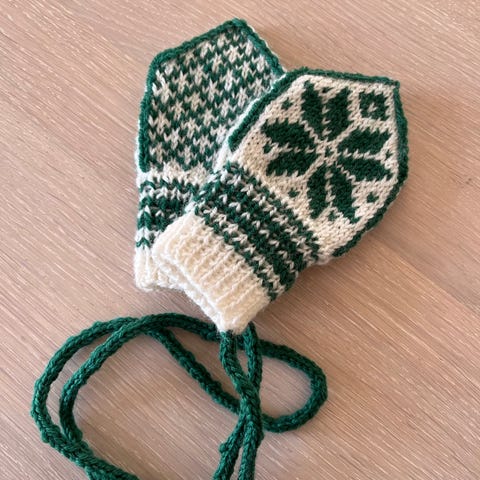 Hjemmestrikket selbuvotter til baby. Passer ca str 62-74. Strikket i 💯 %ull garn.