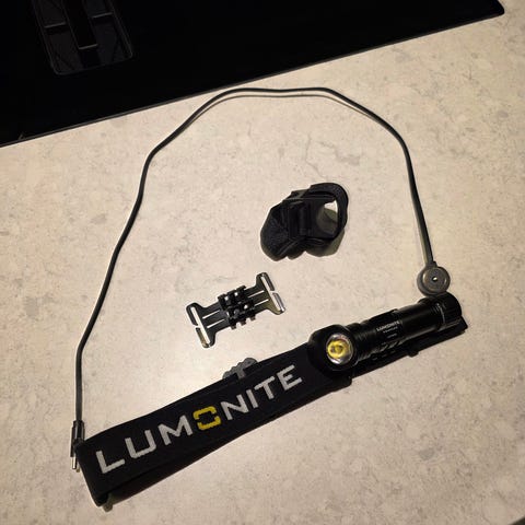 Nitecore HC70 UHE hodelykt med 6000mAh batteri, IP68-klassifisering for vann- og støvbestandighet. Lykt med flere lysstyrkenivåer og oppladbart 21700-batteri. Farge: svart og gul.