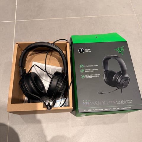 Razer Kraken X gaming headset med over-ear design i svart farge. Utstyrt med justerbar hodebøyle og integrert mikrofon. Har volumkontroll og tilkobling via kabel. Passer for bruk til gaming og annen lydavspilling.