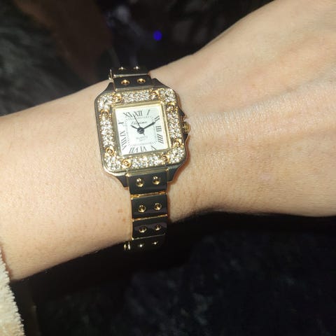 Cartier dameklokke med totonet stål- og gullarmbånd. Klokken har en rund urskive med en kombinasjon av gullfargede detaljer og en mørk urskive. Urkassen er merket med Cartier Original Track og er designet for damer.