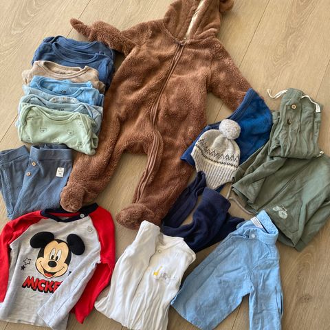Klespakke til gutt størrelse 68/74. En ullbody, syv body, en t-shorte body, tre gensere, en tights i 62/68 og fire par sokker. Brukt til en gutt, noe veldig lite brukt annet mer brukt.