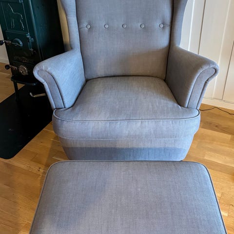 Grå ørelappstol fra Ikea selges rimelig. Den er godt brukt så litt synlige merker er det. Det går kanskje bort ved en rens. En kan også kjøpe nytt trekk til den på IKEA om en ønsker det. De har ulike farger og mønster: https://www.ikea.com/no/no/p/strandmon-trekk-til-orelappstol-naggen-beige-30597908/#content