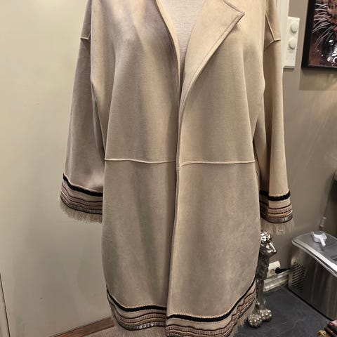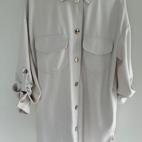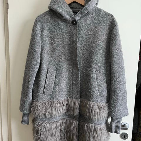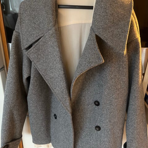 Flott frakk i størrelse L. Liten i størrelsen så vil si den passer en M og S. Lite og pent brukt, skulderputer, feminin fasong, to lommer, og enkeltspent. Selges da den er for liten for meg.
