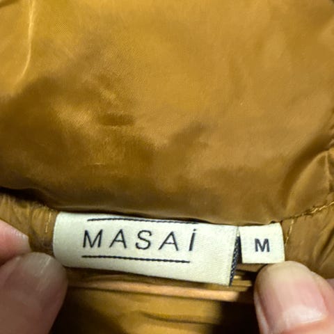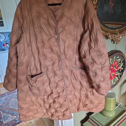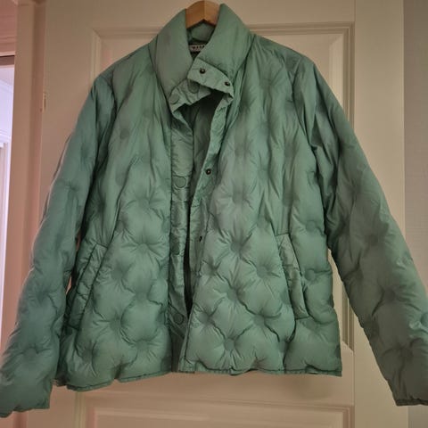 Dunjakke fra Masai selges kr. 550,-. Str. L. Jakken er 3/4 lang. Ytterstoff er Polyamid, Foret med 90 % dun og 10% fjær. Ikke brukt.