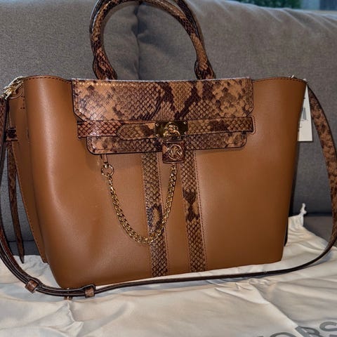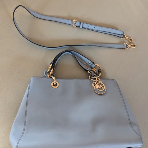Michael Kors dameveske laget i lær med blå farge. Vesken har håndtak og avtakbar skulderrem, samt dekorative detaljer i metall.