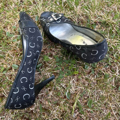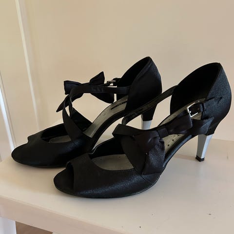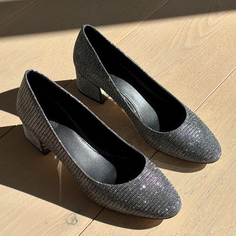 Tesorio hæler i størrelse 38. Skoene har en åpen tå med dekorativ detalj foran. Fargen er glitrende, og de har ankelrem for ekstra støtte. Kun prøvd av meg.