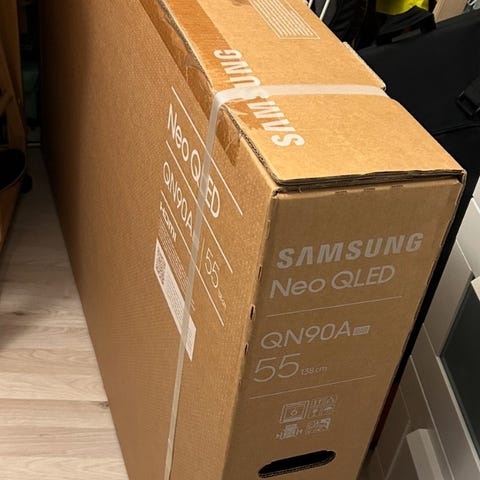 Alt av kabler, veggfeste, ramme i valnøtt (verdi: 990,-) og føtter følger med.
