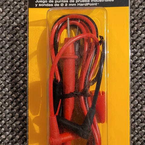 Fluke T5-1000 elektronisk tester med digital skjerm og dreiebryter for valg av målefunksjoner. Utstyrt med testledninger og kabler for måling av spenning, strøm og kontinuitet. Egnet for elektriske målinger innenfor angitte sikkerhetsstandarder.