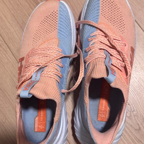 Hoka sko i størrelse 38. Skoene er laget for sportstypen Annet og har en slitesterk Vibram-såle. Farge og materiale er i blåtoner med tekstil og syntetiske materialer.
