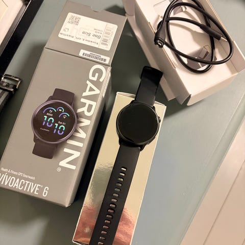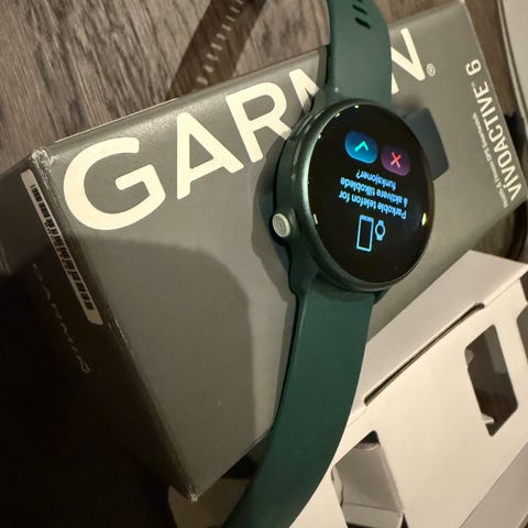 Garmin Vivoactive 6 smartklokke med grønn rem. Enhet for helse- og treningsmåling med flere funksjoner. Leveres med original emballasje, ladekabel og bruksanvisning.