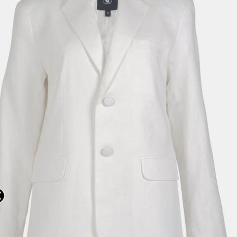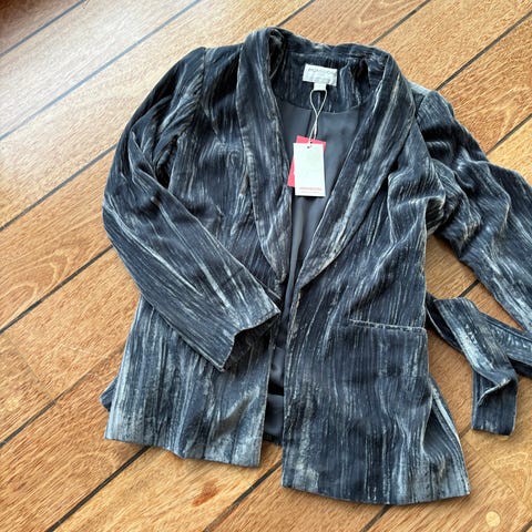 Blazer for kvinner i størrelse M. Jakken er grå og laget av polyester. Den har to knapper foran og lommer med klaff. Innsiden av jakken er foret, og den har et belte bak for justering av passform.