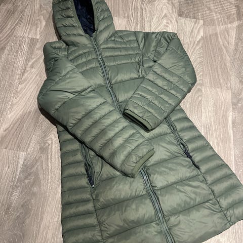 Kjempesøt vinterkåpe fra Name it i str. 10-11 år/140 cm og romslig i størrelsen. Polyester og ull. Mørk blåmønstret m mange fine detaljer. Stikklommer i sidene og innerlomme. Både glidelås og trykknapper (som ser ut som knapphullsknapper) og strikk nederst på ermene, se bildene. Pent brukt.