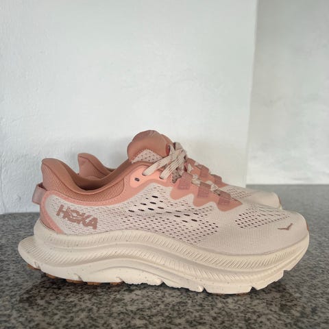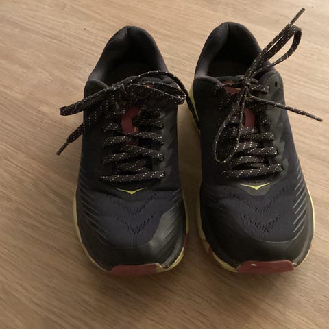 Hoka løpesko i størrelse 37 med blå og gul farge. Skoene er designet for løping og har en polstret såle for støtdemping. Overmaterialet er pustende for god ventilasjon under aktivitet.