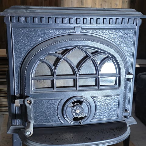 Jøtul 3 vedovn i støpejern med hvit overflate. Ovnen har en glassdør med dekorative buede ruter og en rund ventil på toppen for regulering av lufttilførsel. Designet er tradisjonelt med detaljer i støpejern, egnet for oppvarming av rom.