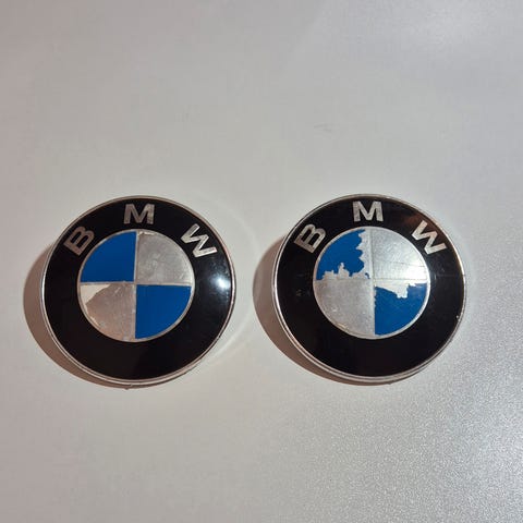 BMW emblem med diameter på 74 mm. Emblemet har svart og hvit farge og rund form.