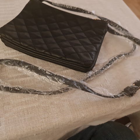 Accessories veske. Vesken har en rektangulær form og er utstyrt med en gullfarget kjedestropp. Den lukkes med en metallramme og har et romslig indre med en liten lomme. Vesken har en lys farge og et glatt ytre materiale.