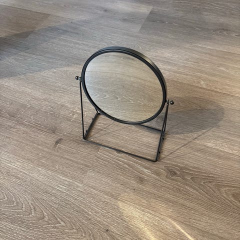 IKEA rundt speil med svart ramme. Speilet har en enkel og moderne design som passer til ulike rom og innredningsstiler. Kjøpt i juli 2023