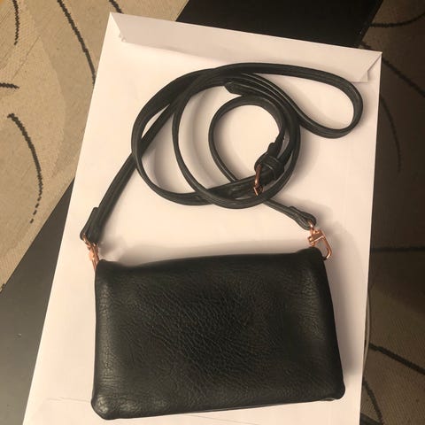 Bikbok skulderveske for dame laget i svart lær. Vesken har en skulderrem med kjededetaljer og en lukking med spenne foran. Den har flere rom for oppbevaring av personlige eiendeler.