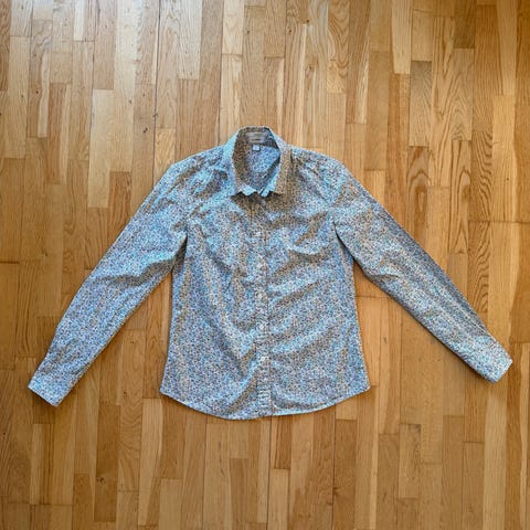 100% bomull skjorte i størrelse XS for ungdomsjenter eller kvinner (brystomkrets 83cm max). Skjorten har en hvit base med blomsterprint i ulike farger.