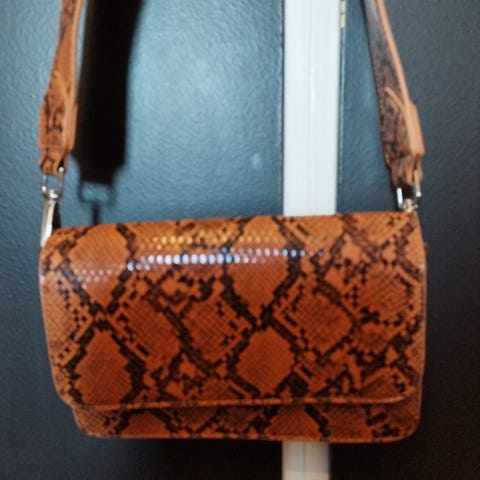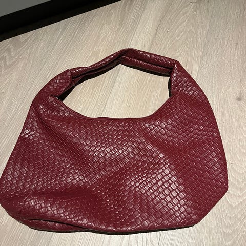 Pieces skulderveske. Veskens design inkluderer en klaff med lås, samt en lang skulderrem med kjededetaljer. Innvendig har vesken et rom med glidelås for oppbevaring av mindre gjenstander.