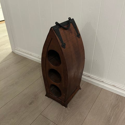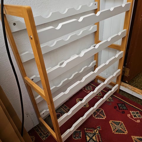 Hjemmelaget Vinhylle I enkel utførelse, noe krommet/bøyd trevirke men fungerer til hensikt(ubehandlet trevirke). Holder til vinopptrekker. Selges