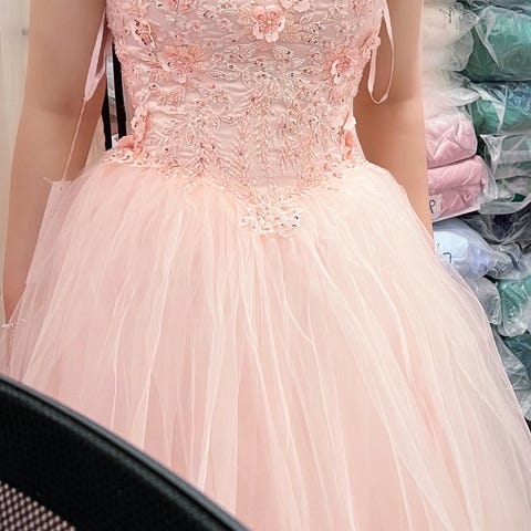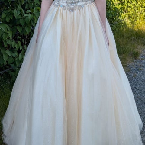 Nydelig ballkjole med innstrammings bånd bak. Veske kan leies med og sko str.39. Underkjole følger med